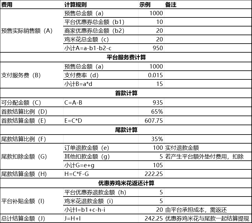 3.1项目预售总金额以具体项目中显示的金额为准。预售总金额扣除平台服务费、优惠券、鸡米花部分的金额,为项目可分配金额,可分配金额将由新物集按照项目首款与尾款分两次向发起者进行结算。